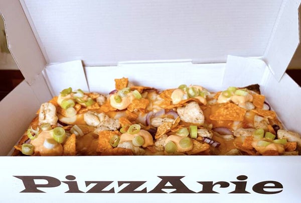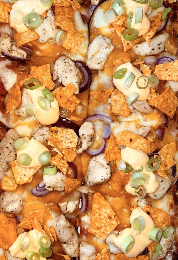 Tomatensaus, mozzarella, cheddar, kip, rode ui, nacho's en bosuitjes