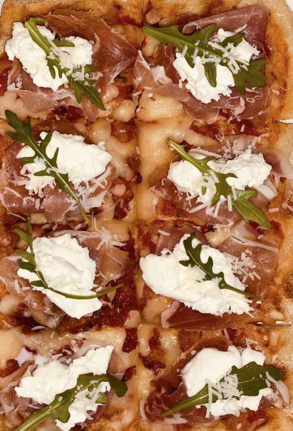 Tomatensaus, mozzarella, prosciutto, parmezaanse kaas, rucola en pijnboompitjes